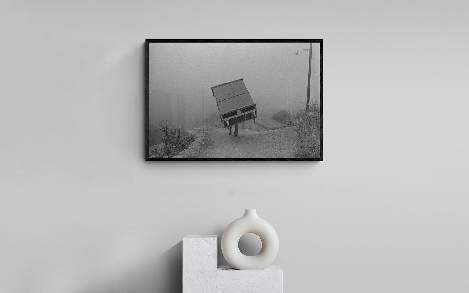wardrobe on his back as his house was damaged in Masouleh village on a foggy day on June 24th,