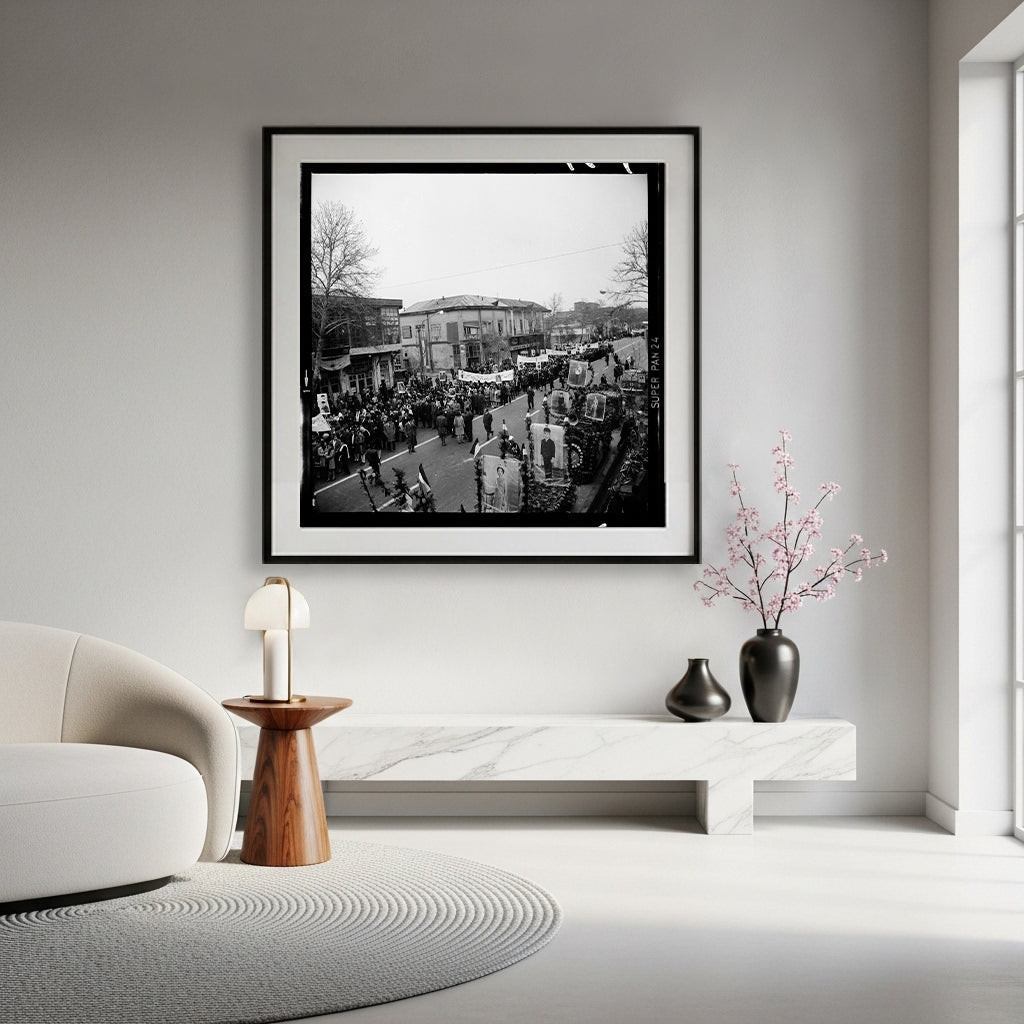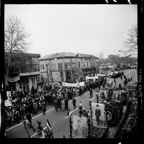 People walking on streets of Tehran during happening “White Revolution” with images of Shah and his family.