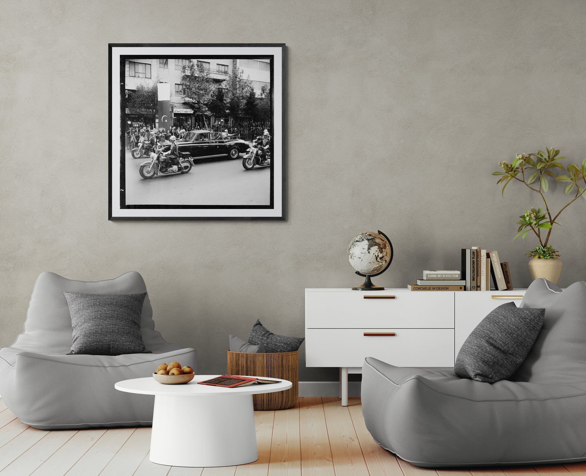 Mohammad Reza Shah with president of Pakistan inside a car on Enghelab st. surrouned by his security guards.