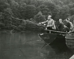 The image captures a moment of leisure during Mohammad Reza Shah Pahlavi’s reign in Iran, sometimes in the 1960s or 1970s. In this period, the Shah was known for his love of fishing, and he often went on fishing trips with his close friends and family. The image shows the Shah and his companions on a fishing boat, enjoying the tranquility of the water and the thrill of the catch. In the foreground, we see the Shah holding a fishing rod, his gaze fixed on the water, as he waits for a fish to bite. Behind him, his companions are engaged in conversation, their faces and postures relaxed and carefree. The boat rocks gently on the calm waters of a lake or a river, surrounded by lush greenery and a clear blue sky. The image captures a moment of respite from the political turmoil and social upheaval that Iran would soon experience. The Shah’s reign would come to an end in 1979, with the Iranian Revolution that led to the establishment of an Islamic republic. The Image serves as a reminder of a bygone era, a moment of calm before the storm.